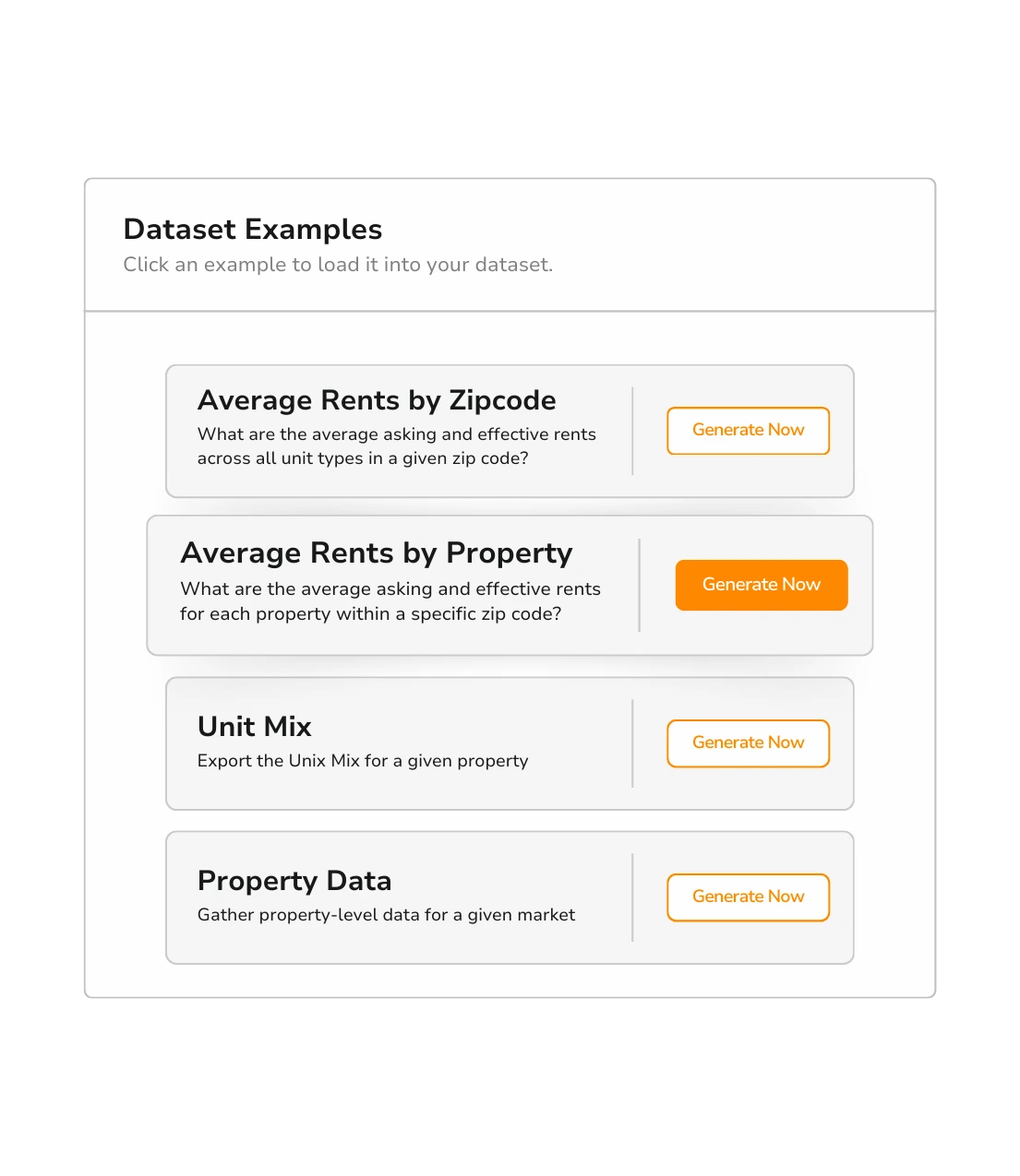 Create detailed custom datasets for any multifamily market, asset size, vintage or property type, analyze monthly or weekly rent and leasing trends, and export to CSV in seconds.