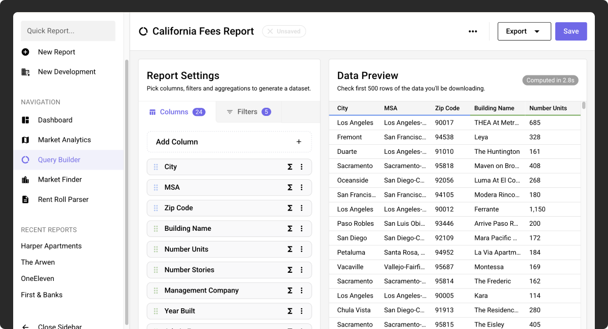 Analyze complete multifamily market data with no code and no hassle. Use our drag-and-drop filters to surface the exact datapoints you need in a few clicks.